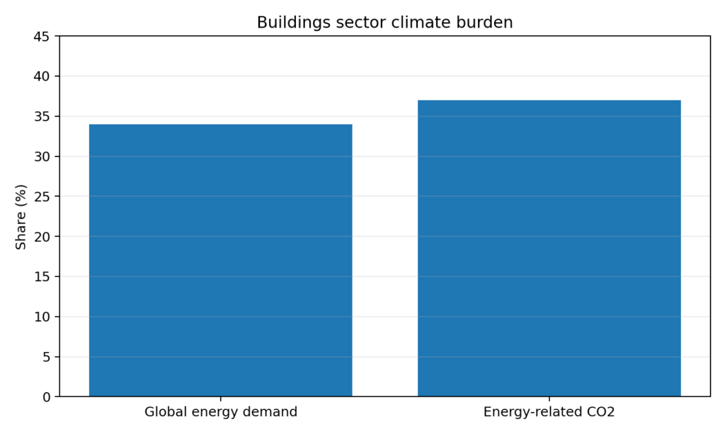 UNEP’s numbers are the real wake-up call. The buildings sector is responsible for roughly 34% of global energy demand and 37% of energy-related CO₂ emissions. When a sector has that kind of footprint, even modest improvements in design coordination and material efficiency matter.