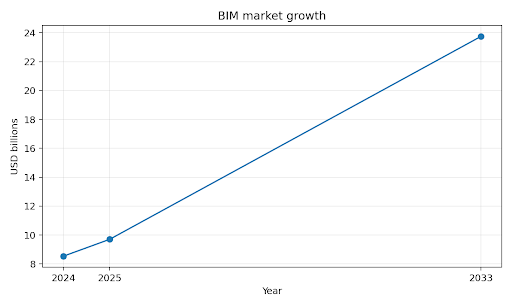 The BIM market is expected to rise from USD 8.53 billion in 2024 to USD 23.74 billion by 2033, which is nearly 2.8 times larger. That growth reflects a market that is moving toward coordinated, data-rich project delivery.